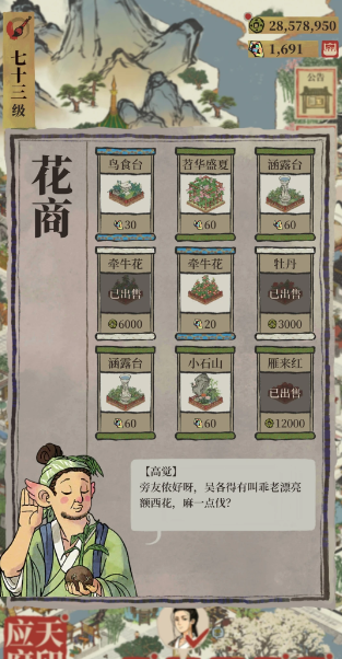 找到花商只是第一步,要成功进行交易还需要满足一个前提条件,那就是你的知府等级必须达到20级。等级解锁之后,你就可以与花商兄弟进行买卖了。花商分为高明和高觉两兄弟,他们售卖的花坛种类有所不同,高明提供的是普通花坛,而高觉那里则能买到更为稀有的花坛款式,这些花坛可以用来装饰你的城市,提升美观度。需花商并非每日必到,他的来访间隔是随机的,可能隔几天才会出现一次,但每次出现都会停留完整的24小时,如果你在某天零点过后没有发现他,那很可能意味着他当天不会来了。