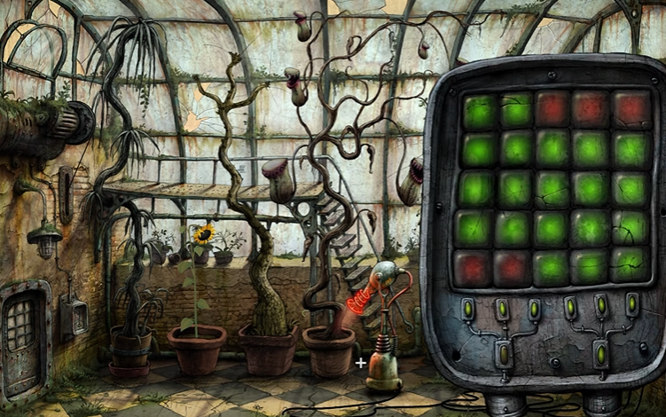 当你来到一个装有大型发动扇的场景时,走上前去互动,它会给你出几道题。这里回答对错都可以,目的是让它发怒,导致其扇叶飞出去,从而可以进入扇叶留下的洞口。爬进去后,你会进入一个种植着各种植物的温室房间。留意房间右侧的两个抽屉状物体,将它们吃掉获取。去房间右侧的墙壁处,那里有一个带有屏幕的机器,上面显示着一个类似棋盘的游戏,你的目标是通过操作,让所有红色的棋子无路可走即可。完成这个小游戏是推进流程的关键。