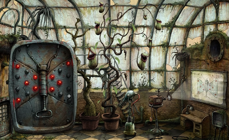 你需要用那把黄色叉子去处理温室里另一株猪笼草。用叉子将它叉起来,然后伸手进去,可以安全地拿到一个放大镜,否则会被咬。注意观察窗户,会有一只蝴蝶飞来并停在栏杆上。这时,迅速使用放大镜仔细观察蝴蝶翅膀上的花纹,并牢牢记下来。记住图案后,去拉动一个类似蝴蝶尾巴的把手,旁边的一扇门就会打开。