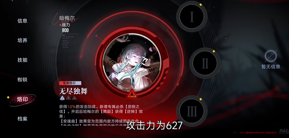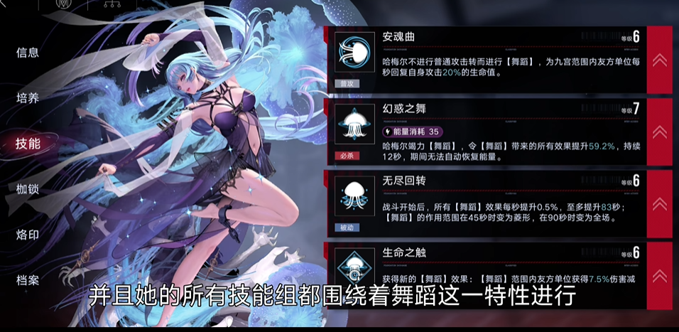 哈梅尔的专属烙印无尽独舞是其功能发生战略转变的关键,使她从一个纯治疗角色转变为兼具输出与增伤能力的多面手。该专属烙印提供攻击力百分比加成。其核心效果是新增专属必杀悲悯之伐,开启后哈梅尔的舞蹈获得逆转效果:原本提供治疗的安魂曲效果变为使范围内敌方持续损失生命,而提供减伤的生命之触效果变为使范围内敌方承受伤害增加。逆转后的效果会原技能等级的提升而提升,并且可以再次使用该技能关闭逆转效果。这意味着在解锁专属烙印后,哈梅尔可以根据战斗需要,灵活切换模式,在需要高压治疗时维持常规舞蹈,在需要补充伤害或强化团队输出时开启逆转模式,对敌方造成持续伤害并为其附加易伤状态,极大地拓展了她的战术价值。