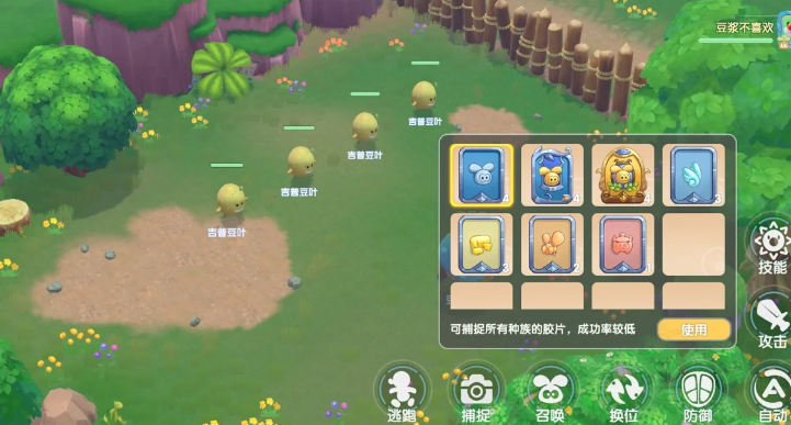 捕捉精灵需要使用胶片道具,这些胶片可以在晶石商店中购买。找到地图上的精灵分布点后,点击进入战斗界面,关闭自动战斗模式,然后选择捕捉按钮并使用胶片进行尝试。捕捉不是百分百成功的,但通过攻击降低精灵的血量可以提高捕捉成功率,剑士的毁伤和崩牙技能在这方面尤其有用。